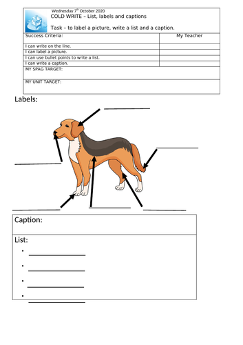 PPT that explores list, labels and captions | Teaching Resources File previews. ppt, 13.21 MB. A good resource for introducing and discussing lists, labels and captions. Labels, lists and captions - Y1 | Teaching Resources 1 review File previews pptx, 60.11 KB ppt, 373 KB Simple worksheets, the first one asks the children to write a shopping list. The second are little strips for the children to stick in their book, then cut+stick the pictures of objects and write a caption for each! Hope it helps - please comment. Tes classic free licence Review shanthimerwin English Year 1 Autumn Labels, Lists and Signs - Hamilton Trust Non-fiction English Year 1 Autumn Labels, Lists and Signs Getting and giving information Spark imaginations with Not a Stick by Antoinette Portis and Billy's Bucket by Kes Gray and Garry Parsons. Explore sentence building and punctuation, writing labels, lists and signs. Start with the core unit to introduce key texts. Learn to write great yearbook captions with this video, lesson plan A Simple Approach to Great Captions Walsworth Yearbooks The objectives for the lesson plan include students learning the parts of a good caption and how to write them to identify people, be accurate and informative. Burke also said caption writing is easier to approach because it's a group of smaller pieces instead of a multi-paragraph article.