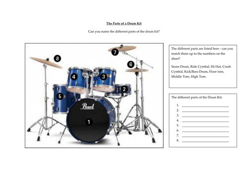 How to Setup a Drum Kit - Compete Guide For Beginners - DeboBand The most popular drum kit comprises a boomy bass drum, a floor tom, two mounted toms, and a snare drum. This is known as a 5 piece drum kit. Usually, these drums will be placed in order by size - with the largest tom on your left, the smallest on your right, and the big daddy kick-drum in center stage. Label a drum Kit Diagram - ESL worksheet by mchal2 Label a drum kit and learn about percussion/drum clef Welcome to ESL Printables , the website where English Language teachers exchange resources: worksheets, lesson plans, activities, etc.