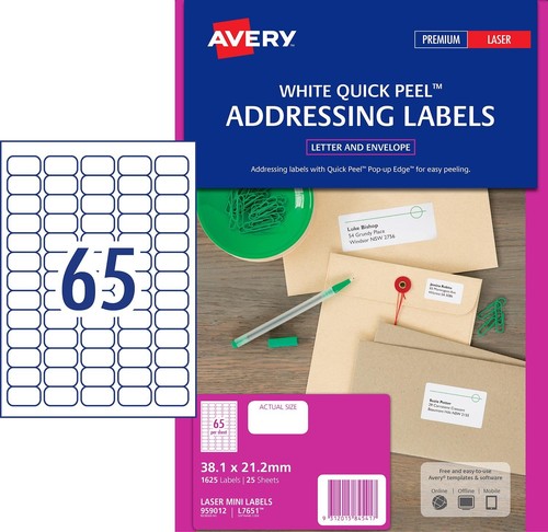 Avery Mini Address Labels Laser 65 per Sheet 38.1x21.2mm White Ref ... Avery Mini Address Labels are a great little way to ensure undelivered mail is returned to the sender. These small sized labels come in 65 labels per sheet and are guaranteed to run smoothly through your laser printer. Whether you're printing in black and white or adding colour, these . Home; About ...